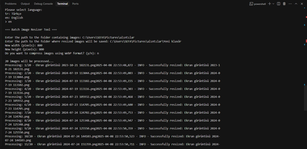 Supports multiple image formats (JPG, PNG, WebP), batch resizing, optional WebP compression, progress tracking, and error logging